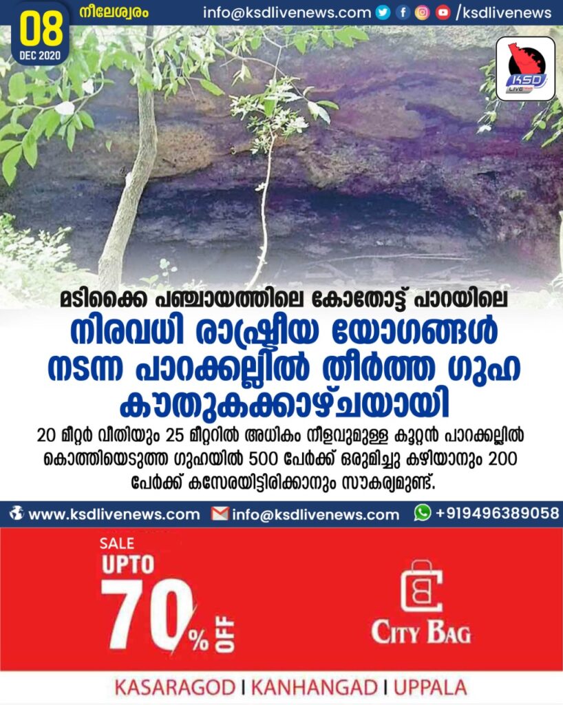 നീലേശ്വരം : രാഷ്ടീയ യോഗങ്ങൾ ഉൾപ്പെടെ നടന്ന ഗുഹ തിരഞ്ഞെടുപ്പുകാല കൗതുകമാകുന്നു . മടിക്കൈ പഞ്ചായത്തിൽ കോതോട്ടുപാറ മാളത്തുങ്കാൽ ടി.തമ്പാന്റെ സ്ഥലത്താണ് 20 മീറ്റർ വീതിയും 25 മീറ്ററിൽ അധികം നീളവുമുള്ള കൂറ്റൻ പാറക്കല്ലിൽ കൊത്തിയെടുത്ത ഗുഹയുള്ളത് . 15 വർഷം മുൻപു വരെ സിപിഐ കാഞ്ഞിരപ്പൊയിൽ ബ്രാഞ്ച് കമ്മിറ്റിയുടെ യോഗങ്ങൾ ഗുഹയ്ക്കകത്തു ചേർന്നിരുന്നതായി തമ്പാൻ ഓർക്കുന്നു . കയ്യൂർ സമര കാലത്ത് പൊലീസിൽ നിന്നു രക്ഷപ്പെടാൻ ഗുഹയ്ക്കകത്ത് അഭയം തേടിയവരുമുണ്ട് . 500 പേർക്ക് ഒരുമിച്ചു കഴിയാനും 200 പേർക്ക് കസേരയിട്ടിരിക്കാനും സൗകര്യമുണ്ട് ഇതിനകത്ത് . ഗുഹയുടെ മുകൾ ഭാഗം ഫുട്ബോൾ മൈതാനമാണ് . പ്രവേശന ഭാഗത്ത് 3 മീറ്ററിൽ അധികം ഉയരമുണ്ട് . ഇവിടെ നിന്ന് 75 അടിയോളം ദൂരം പ്രയാസമില്ലാതെ നടന്നു പോകാം . പിന്നെയും പോകാൻ വെളിച്ചം വേണം . ഇടവഴിയിലൂടെ അകത്തേക്കു പോയാൽ കാണുന്ന ഒരാൾ പൊക്കത്തിലുള്ള അറകളിൽ 10 പേർക്ക് കഴിയാം . തമ്പാനും അയൽവീട്ടുകാർക്കും വെയിലും മഴയുമേൽക്കാതെ സാധനങ്ങൾ സൂക്ഷിക്കാനുള്ള ഗോഡൗൺ കൂടിയാണിത് . ധാരാളം പുല്ലുകളും ചെറു സസ്യങ്ങളും ഉള്ളതിനാൽ ഗുഹയ്ക്കകത്തു കന്നുകാലികളെ മേയാൻ കെട്ടുന്നവരുമുണ്ട് . കൊയ്ത്ത്തു കഴിഞ്ഞാൽ വൈക്കോൽ ഉണക്കാനും ഇവിടം ഉപയോഗിക്കുന്നു . ഗുഹാമുഖത്ത് ഔഷധ സസ്യങ്ങളും മരങ്ങളുമുണ്ട് . സ്കൂൾ കുട്ടികളും ഗുഹ കാണാനെത്താറുണ്ട് . സുന്ദര കാഴ്ചയൊരുക്കുന്ന തൊട്ടടുത്തുള്ള കൊല്ലംകുന്നു പാറ മുകളിൽ നിന്നു നോക്കിയാൽ അതിമനോഹരമായ ദൂരക്കാഴ്ചയും സൂര്യാസ്തമയവും കാണാം .