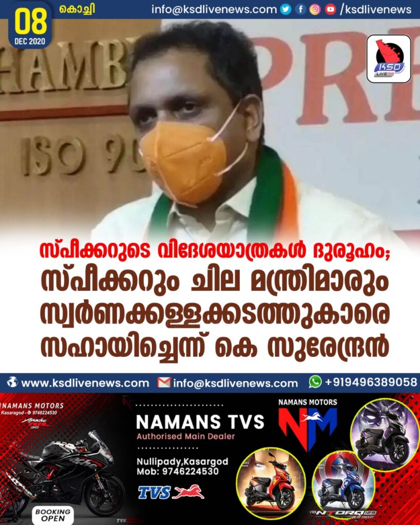 സ്പീക്കറുടെ വിദേശയാത്രകൾ ദുരൂഹം ; സ്പീക്കറും ചില മന്ത്രിമാരും സ്വർണക്കള്ളക്കടത്തുകാരെ സഹായിച്ചെന്ന് കെ സുരേന്ദ്രൻ