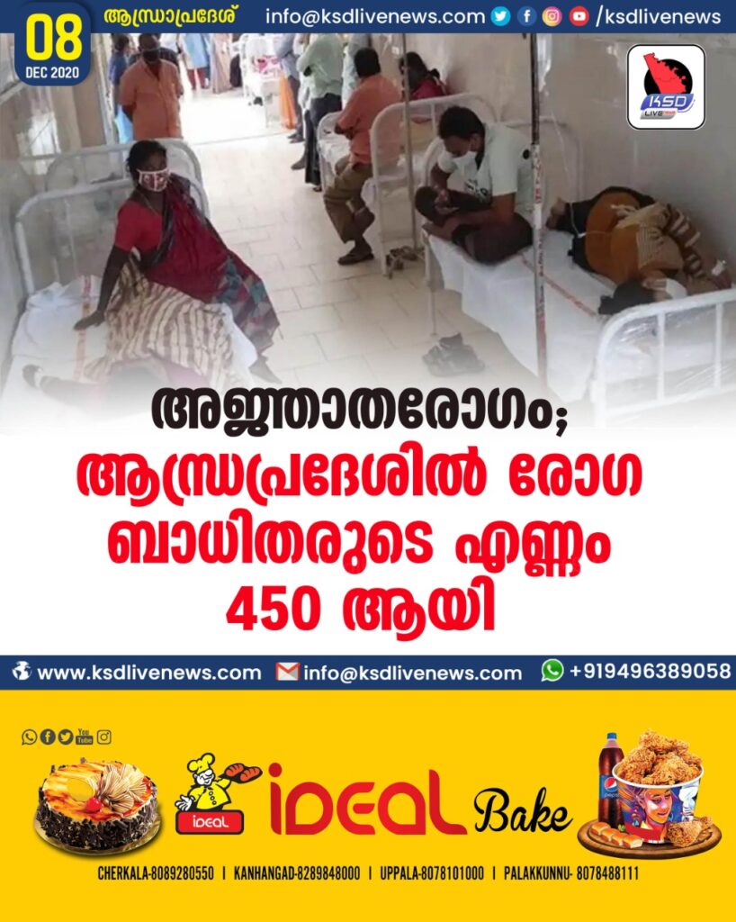 ആ​ന്ധ്ര​പ്ര​ദേ​ശി​ലെ ഏ​ലൂ​രു​വി​ല്‍ അ​ജ്ഞാ​ത​രോ​ഗം ബാ​ധി​ക്കു​ന്ന​വ​രു​ടെ എ​ണ്ണം പെ​രു​കു​ന്നു. ഇ​തു​വ​രെ 450 പേ​ര്‍​ക്കു രോ​ഗം സ്ഥി​രീ​ക​രി​ച്ചു. ഏ​ലു​രു​വി​ലെ വ​ണ്‍ ടൗ​ണി​ലാ​ണ് രോ​ഗം ആ​ദ്യ​മാ​യി ക​ണ്ടെ​ത്തി​യ​ത്. ഞാ​യ​റാ​ഴ്ച രോ​ഗം ബാ​ധി​ച്ച്‌ ഒ​രാ​ള്‍ മ​രി​ച്ചി​രു​ന്നു.