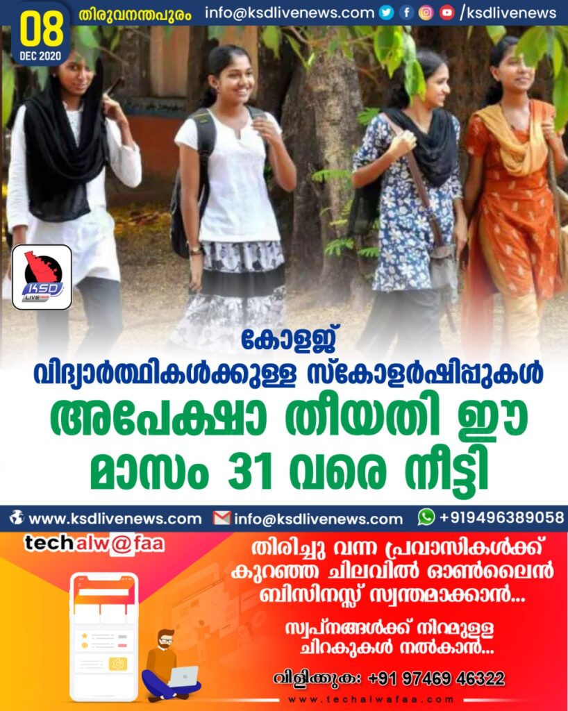 കോളജ് വിദ്യാർത്ഥികൾക്കുള്ള സ്കോളർഷിപ്പുകൾ ; അപേക്ഷാ തീയതി ഈ മാസം 31 വരെ നീട്ടി