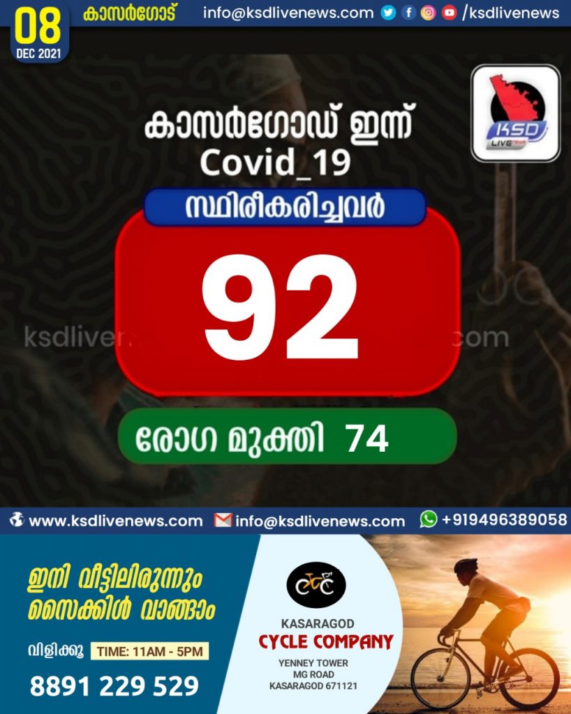 കാസർഗോഡ് ജില്ലയിൽ ഇന്ന് 92 പേർക്ക് കോവിഡ് സ്ഥിരീകരിച്ചു. 74 പേർക്ക് രോഗമുക്തി