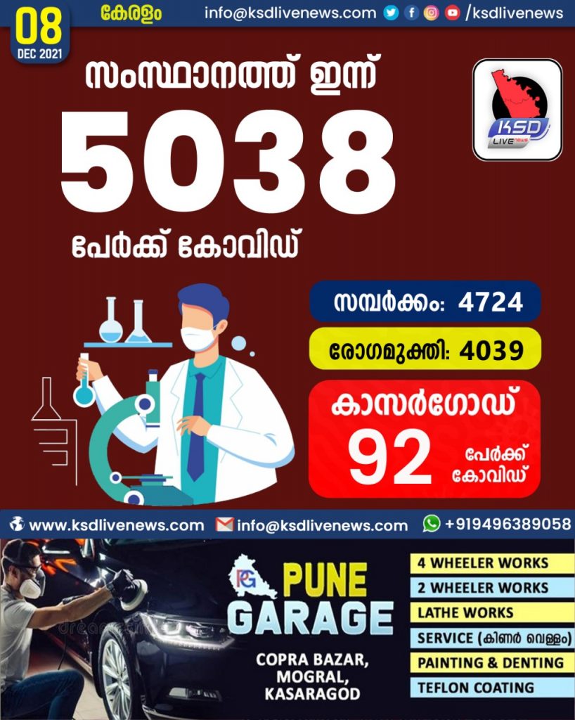 സംസ്ഥാനത്ത് ഇന്ന് 5038 പേർക്ക് കോവിഡ് സ്ഥിരീകരിച്ചു. സമ്പർക്കം വഴി 4724 പേർക്കും ; ആശ്വാസമായി 4039 പേർക്ക് രോഗ മുക്തിയും ; കാസർഗോഡ് ജില്ലയിൽ 92 പേർക്ക് പുതിയ കോവിഡ് കേസുകൾ ; മരണം 35
