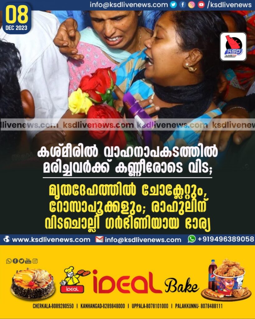 കശ്മീരിൽ വാഹനാപകടത്തിൽ മരിച്ചവർക്ക് കണ്ണീരോടെ വിട; മൃതദേഹത്തിൽ ചോക്ലേറ്റും, റോസാപൂക്കളും; രാഹുലിന് വിടചൊല്ലി ഗർഭിണിയായ ഭാര്യ