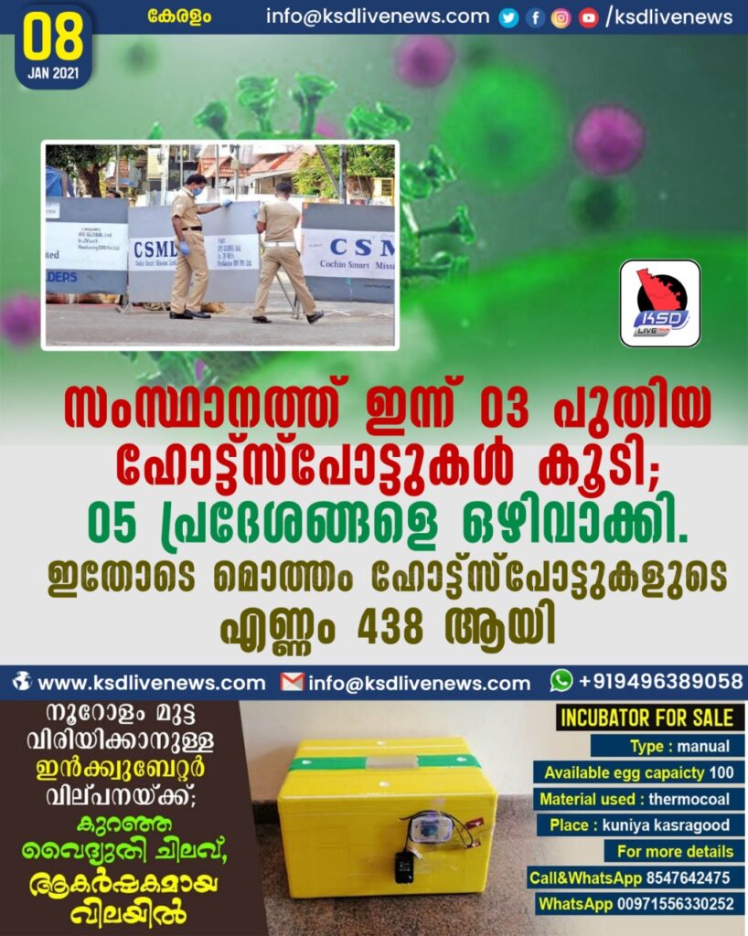 സംസ്ഥാനത്ത് ഇന്ന് 03 പുതിയ ഹോട്ട്സ്പോട്ടുകള് കൂടി; 05 പ്രദേശങ്ങളെ ഒഴിവാക്കി. ഇതോടെ മൊത്തം ഹോട്ട്സ്പോട്ടുകളുടെ എണ്ണം 438 ആയി.