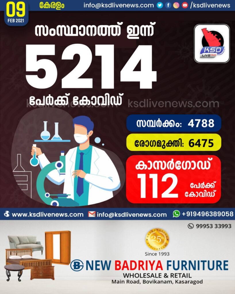 സംസ്ഥാനത്ത് ഇന്ന് 5214 പേർക്ക് കോവിഡ് സ്ഥിരീകരിച്ചു. സമ്പർക്കം വഴി 4788 പേർക്കും ; ആശ്വാസമായി 6475 പേർക്ക് രോഗ മുക്തിയും ; കാസർഗോഡ് ജില്ലയിൽ 112 പേർക്ക് പുതിയ കോവിഡ് കേസുകൾ ; മരണം 19