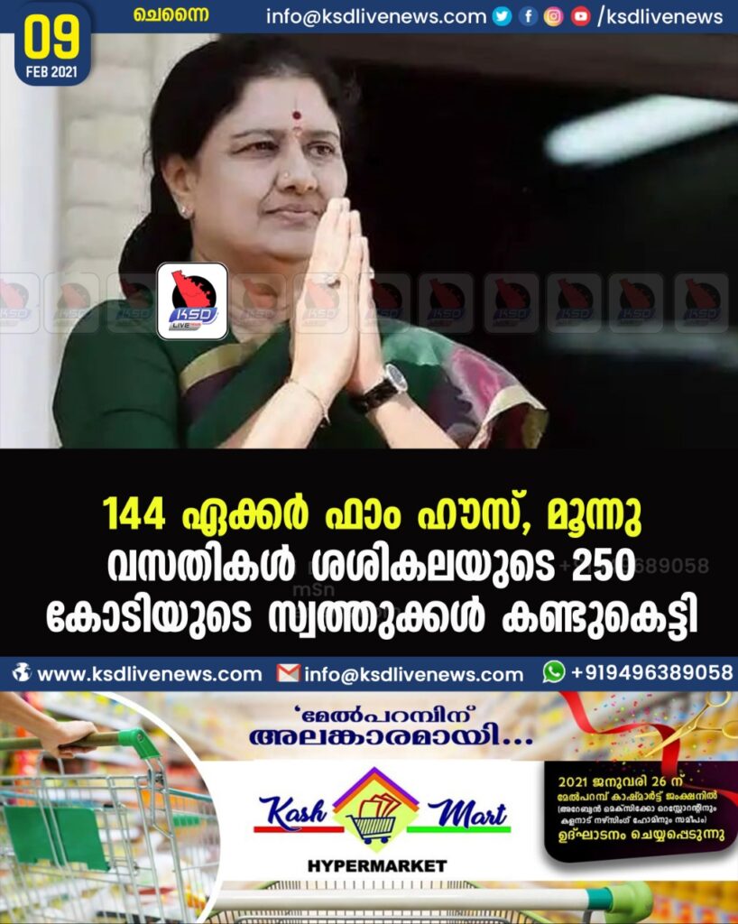 144 ഏക്കർ ഫാം ഹൗസ് , മൂന്നു വസതികൾ ശശികലയുടെ 250 കോടിയുടെ സ്വത്തുക്കൾ കണ്ടുകെട്ടി
