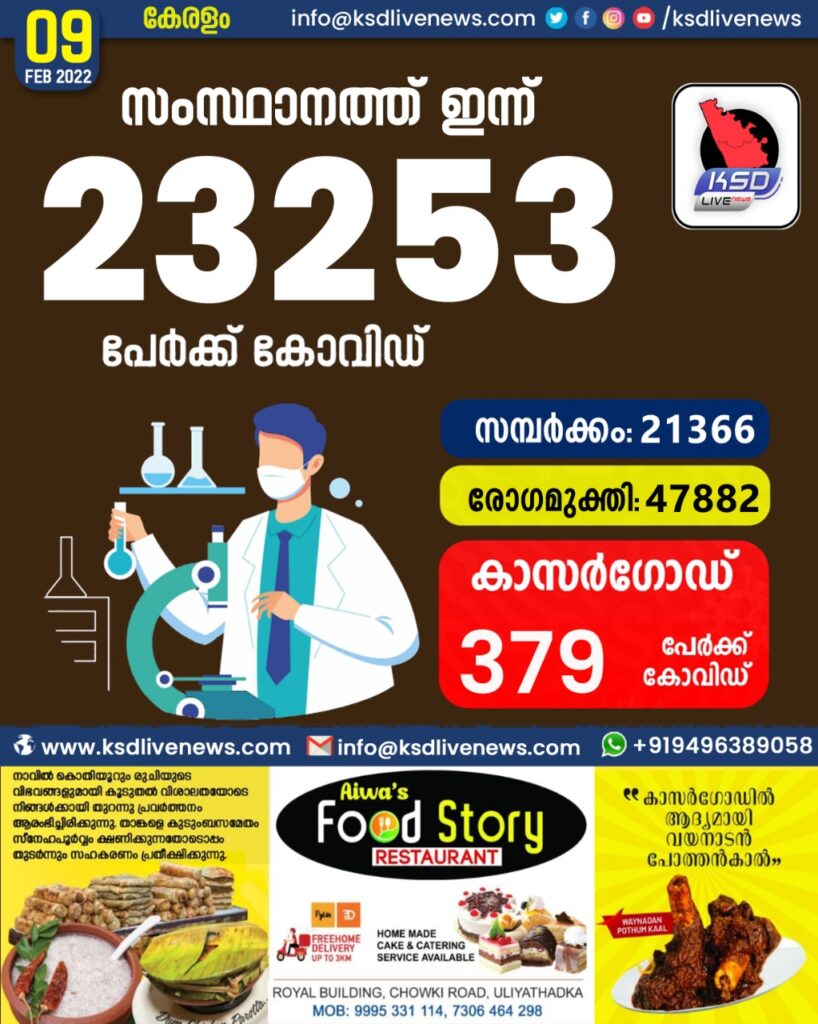 സംസ്ഥാനത്ത് ഇന്ന് 23,253 കോവിഡ് സ്ഥിരീകരിച്ചു. സമ്പർക്കം വഴി 21366 പേർക്കും ; ആശ്വാസമായി 47882 പേർക്ക് രോഗമുക്തി ; കാസർഗോഡ് ജില്ലയിൽ 379 പേർക്ക് പുതിയ കോവിഡ് കേസുകൾ ; മരണം 29