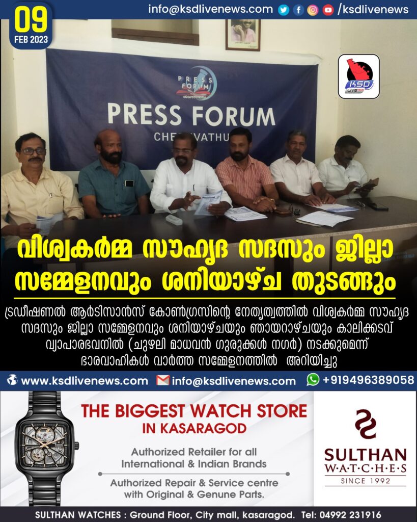ചെറുവത്തൂർ: ട്രഡീഷണൽ ആർടിസാൻസ് കോൺഗ്രസിന്റെ നേതൃത്വത്തിൽ വിശ്വകർമ്മ സൗഹൃദ സദസും ജില്ലാ സമ്മേളനവും ശനിയാഴ്ചയും ഞായറാഴ്ചയും കാലിക്കടവ് വ്യാപാരഭവനിൽ (ചുഴലി മാധവൻ ഗുരുക്കൾ നഗർ) നടക്കുമെന്ന് ഭാരവാഹികൾ വാർത്ത സമ്മേളനത്തിൽ അറിയിച്ചു.