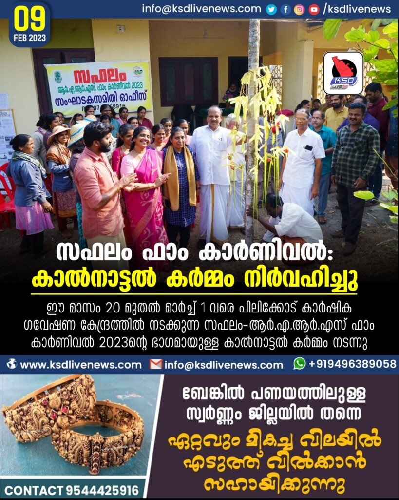 പിലിക്കോട്: ഈ മാസം 20 മുതൽ മാർച്ച് 1 വരെ പിലിക്കോട് കാർഷിക ഗവേഷണ കേന്ദ്രത്തിൽ നടക്കുന്ന ‘സഫലം – ആർ.എ.ആർ.എസ് ഫാം കാർണിവൽ – 2023’ ന്റെ ഭാഗമായുള്ള കാൽനാട്ടൽ കർമ്മം നടന്നു. പിലിക്കോട് പഞ്ചായത്ത് പ്രസിഡന്റ് പി പി പ്രസന്നകുമാരി അധ്യക്ഷതവഹിച്ച ചടങ്ങിൽ ലോക്‌‍സഭാ മണ്ഡലം മുൻ എം.പി പി.കരുണാകരൻ ഉദ്ഘാടനം നിർവ്വഹിച്ചു. കേന്ദ്രം മേധാവി ഡോ.ടി വനജ, അസിസ്റ്റന്റ് പ്രൊഫസർ ഡോ.സഞ്ജു ബാലൻ, മുൻ തൃക്കരിപ്പൂർ എം.എൽ.എ കെ.കുഞ്ഞിരാമൻ, വാർഡ് മെമ്പർ അജിത, അസിസ്റ്റന്റ് പ്രൊഫസർ ക്രിസ് ജോസഫ് തുടങ്ങിയവർ സംസാരിച്ചു. പിലിക്കോട് ഗ്രാമ പഞ്ചായത്ത് മെമ്പർമാരായ പ്രസീത കുമാരി, ബജിത്ത്, പ്രമീള, രേഷ്ണ എന്നിവരും ചടങ്ങിൽ സംബന്ധിച്ചിരുന്നു