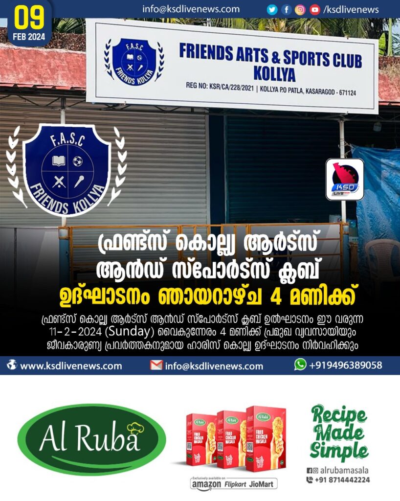 ഫ്രണ്ട്സ് കൊല്ല്യ ആർട്സ് ആൻഡ് സ്പോർട്സ് ക്ലബ് ഉദ്ഘാടനം ഞായറാഴ്ച 4 മണിക്ക്