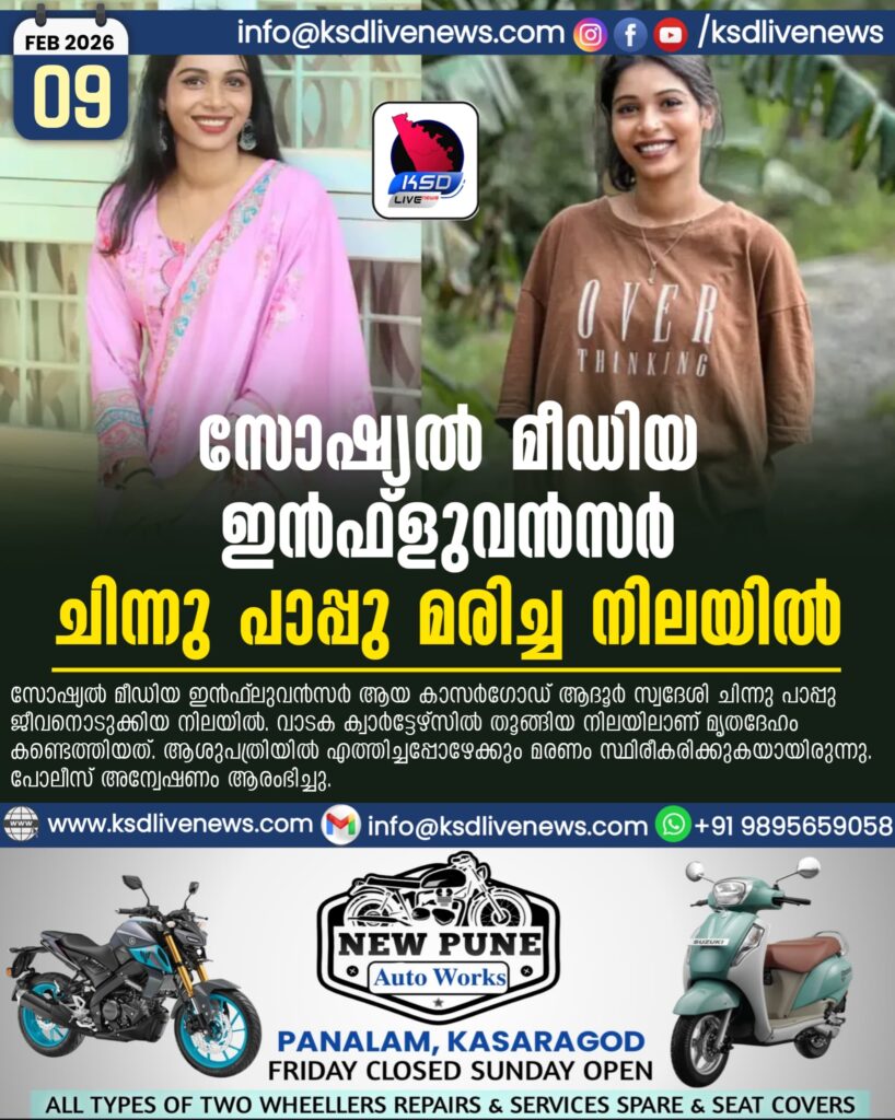 ആദൂർ: സോഷ്യൽ മീഡിയ ഇൻഫ്ലുവൻസർ ആയ കാസർഗോഡ് ആദൂർ സ്വദേശി ചിന്നു പാപ്പു ജീവനൊടുക്കിയ നിലയിൽ. വാടക ക്വാർട്ടേഴ്സിൽ തൂങ്ങിയ നിലയിലാണ് മൃതദേഹം കണ്ടെത്തിയത്. ആശുപത്രിയിൽ എത്തിച്ചപ്പോഴേക്കും മരണം സ്ഥിരീകരിക്കുകയായിരുന്നു. പോലീസ് അന്വേഷണം ആരംഭിച്ചു.