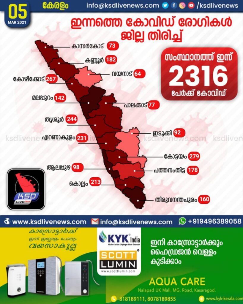 സംസ്ഥാനത്ത് ഇന്ന് 2316 പേര്ക്ക് കോവിഡ്-19 സ്ഥിരീകരിച്ചു. കോട്ടയം 279, കോഴിക്കോട് 267, തൃശൂര് 244, എറണാകുളം 231, കൊല്ലം 213, പത്തനംതിട്ട 198, കണ്ണൂര് 178, തിരുവനന്തപുരം 160, മലപ്പുറം 142, ആലപ്പുഴ 98, ഇടുക്കി 92, പാലക്കാട് 77, കാസര്ഗോഡ് 73, വയനാട് 64 എന്നിങ്ങനേയാണ് ജില്ലകളില് ഇന്ന് രോഗ ബാധ സ്ഥിരീകരിച്ചത്.