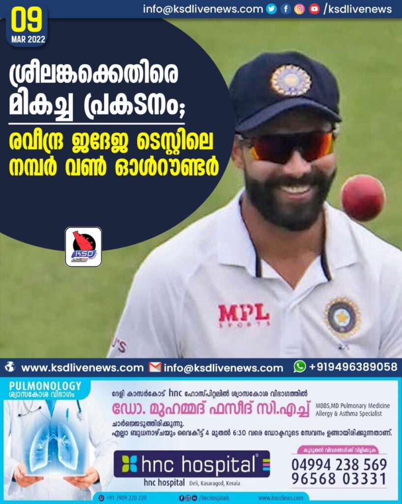 ആദ്യ ഇന്നിങ്സില്‍ പുറത്താകാതെ 175 റണ്‍സെടുത്ത ജദേജ, രണ്ടു ഇന്നിങ്സുകളിലുമായി ഒമ്ബത് വിക്കറ്റുകളും നേടി. 2021 മുതല്‍ വെസ്റ്റിന്‍ഡീസിന്‍റെ ജെയ്സണ്‍ ഹോള്‍ഡറാണ് ഒന്നാം സ്ഥാനത്തുണ്ടായിരുന്നത്. മൊഹാലിയില്‍ ശ്രീലങ്കക്കെതിരായ ഇന്ത്യയുടെ ടെസ്റ്റ് വിജയത്തില്‍ രവീന്ദ്ര ജദേജയുടെ മികച്ച പ്രകടനമാണ് ഓള്‍റൗണ്ടര്‍മാരില്‍ ഒന്നാമനാക്കിയതെന്ന് ഐ.സി.സി പത്രക്കുറിപ്പില്‍ അറിയിച്ചു.