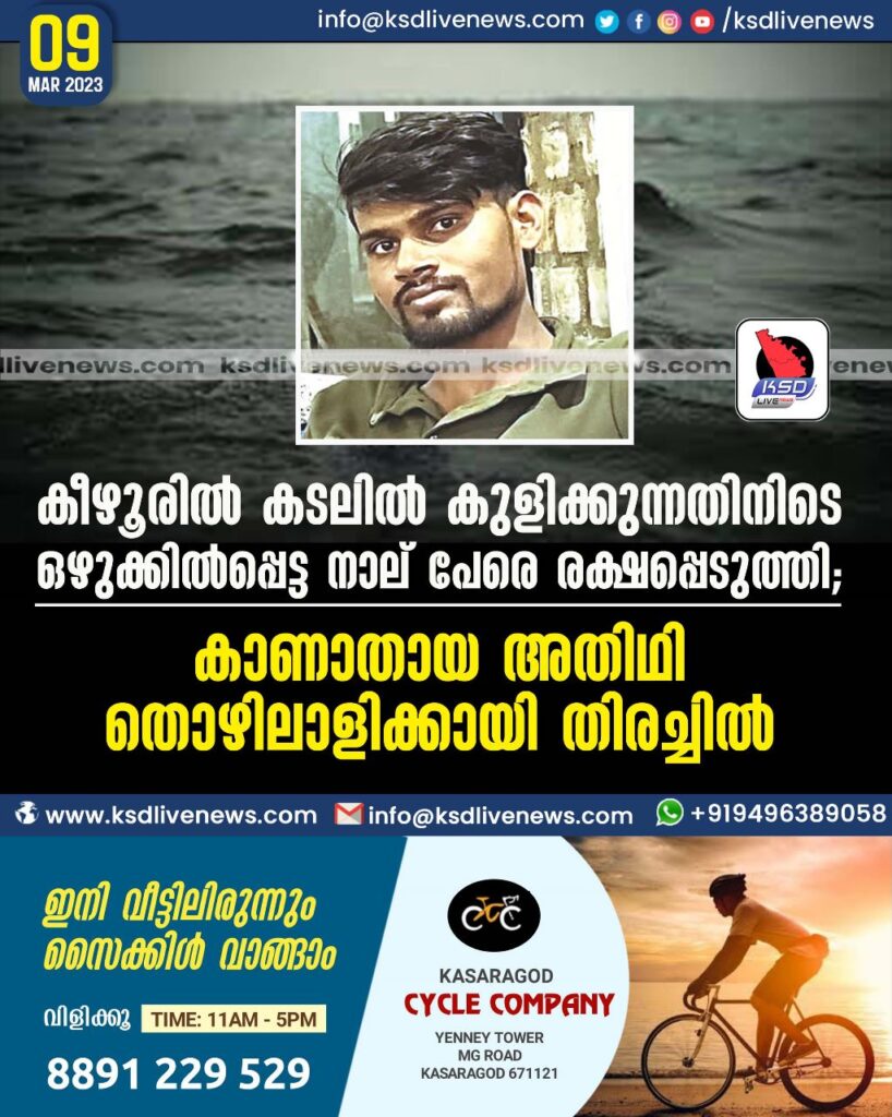 കീഴൂരില് കടലില് കുളിക്കുന്നതിനിടെ ഒഴുക്കില്പ്പെട്ട നാല് പേരെ രക്ഷപ്പെടുത്തി; കാണാതായ അതിഥി തൊഴിലാളിക്കായി തിരച്ചില്