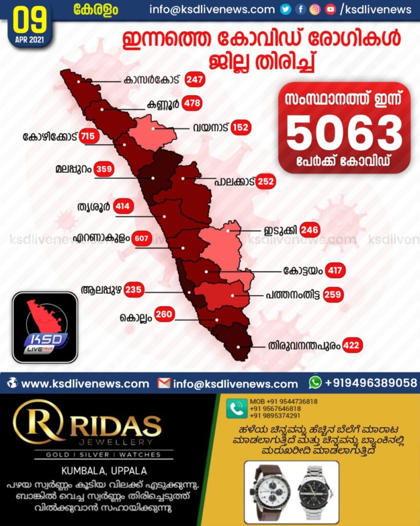 സംസ്ഥാനത്ത് ഇന്ന് 5063 പേര്ക്ക് കോവിഡ്-19 സ്ഥിരീകരിച്ചു. കോഴിക്കോട് 715, എറണാകുളം 607, കണ്ണൂര് 478, തിരുവനന്തപുരം 422, കോട്ടയം 417, തൃശൂര് 414, മലപ്പുറം 359, കൊല്ലം 260, പത്തനംതിട്ട 259, പാലക്കാട് 252, കാസര്ഗോഡ് 247, ഇടുക്കി 246, ആലപ്പുഴ 235, വയനാട് 152 എന്നിങ്ങനേയാണ് ജില്ലകളില് ഇന്ന് രോഗ ബാധ സ്ഥിരീകരിച്ചത്.