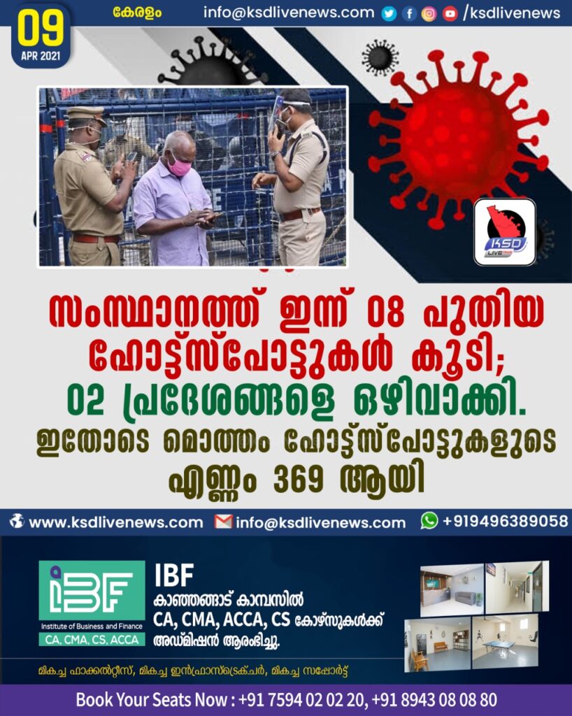 സംസ്ഥാനത്ത് ഇന്ന് 08 പുതിയ ഹോട്ട്സ്പോട്ടുകള് കൂടി; 02 പ്രദേശങ്ങളെ ഒഴിവാക്കി. ഇതോടെ മൊത്തം ഹോട്ട്സ്പോട്ടുകളുടെ എണ്ണം 369 ആയി.SHARE THIS ONസംസ്ഥാനത്ത് ഇന്ന് 08 പുതിയ ഹോട്ട്സ്പോട്ടുകള് കൂടി; 02 പ്രദേശങ്ങളെ ഒഴിവാക്കി. ഇതോടെ മൊത്തം ഹോട്ട്സ്പോട്ടുകളുടെ എണ്ണം 369 ആയി