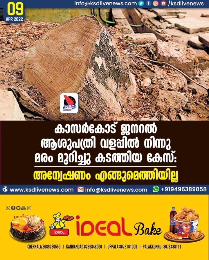 കാസർകോട് ജനറൽ ആശുപത്രി വളപ്പിൽ നിന്നു മരം മുറിച്ചു കടത്തിയ കേസ്: അന്വേഷണം എങ്ങുമെത്തിയില്ല