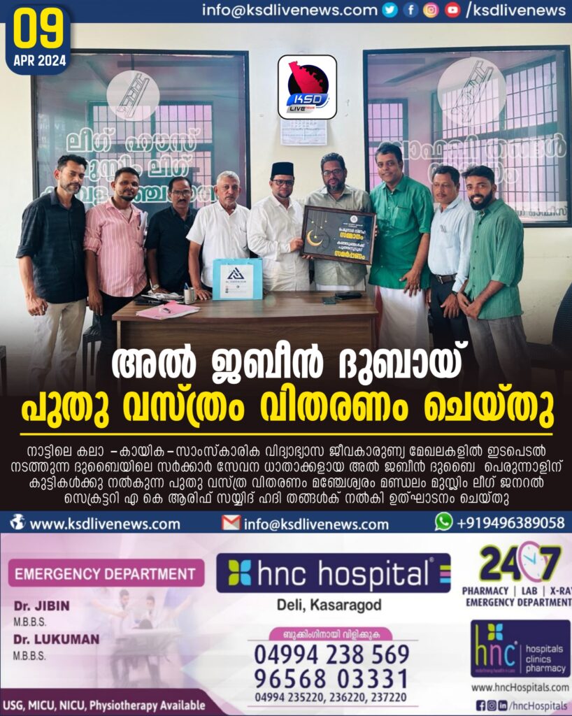 കുമ്പള: നാട്ടിലെ കലാ -കായിക- സാംസ്കാരിക വിദ്യാഭ്യാസ ജീവകാരുണ്യ മേഖലകളിൽ ഇടപെടൽ നടത്തുന്ന ദുബൈയിലെ സർക്കാർ സേവന ധാതാക്കളായ അൽ ജബീൻ ദുബൈ  പെരുന്നാളിന്  കുട്ടികൾക്കു നൽകുന്ന പുതു വസ്ത്ര വിതരണം മഞ്ചേശ്വരം മണ്ഡലം മുസ്ലിം ലീഗ് ജനറൽ സെക്രട്ടറി എ കെ ആരിഫ് സയ്യിദ് ഹദി തങ്ങൾക് നൽകി ഉത് ഘാടനം ചെയ്തു   ബ്ലോക്ക് പഞ്ചായത്ത് സ്റ്റാന്റിങ് കമ്മിറ്റി ചെയർമാൻ അഷ്‌റഫ്‌ കർള സ്വാഗതം പറഞ്ഞു ബി എൻ മുഹമ്മദ്‌ അലി. അസിസ് കളത്തൂർ,ഇബ്രാഹിം ബത്തേരി, കെ വി യുസഫ്,മുഹമ്മദ്‌ കുഞ്ഞി ആരിക്കാടി,ഫസൽ പേരാൽ, സമീർ കുമ്പള. ജംഷിർ മൊഗ്രാൽ. നൗഫൽ  കന്തൽ.  അനസ് ബായാർ  തുടങ്ങിയവർ പങ്കെടുത്തു
