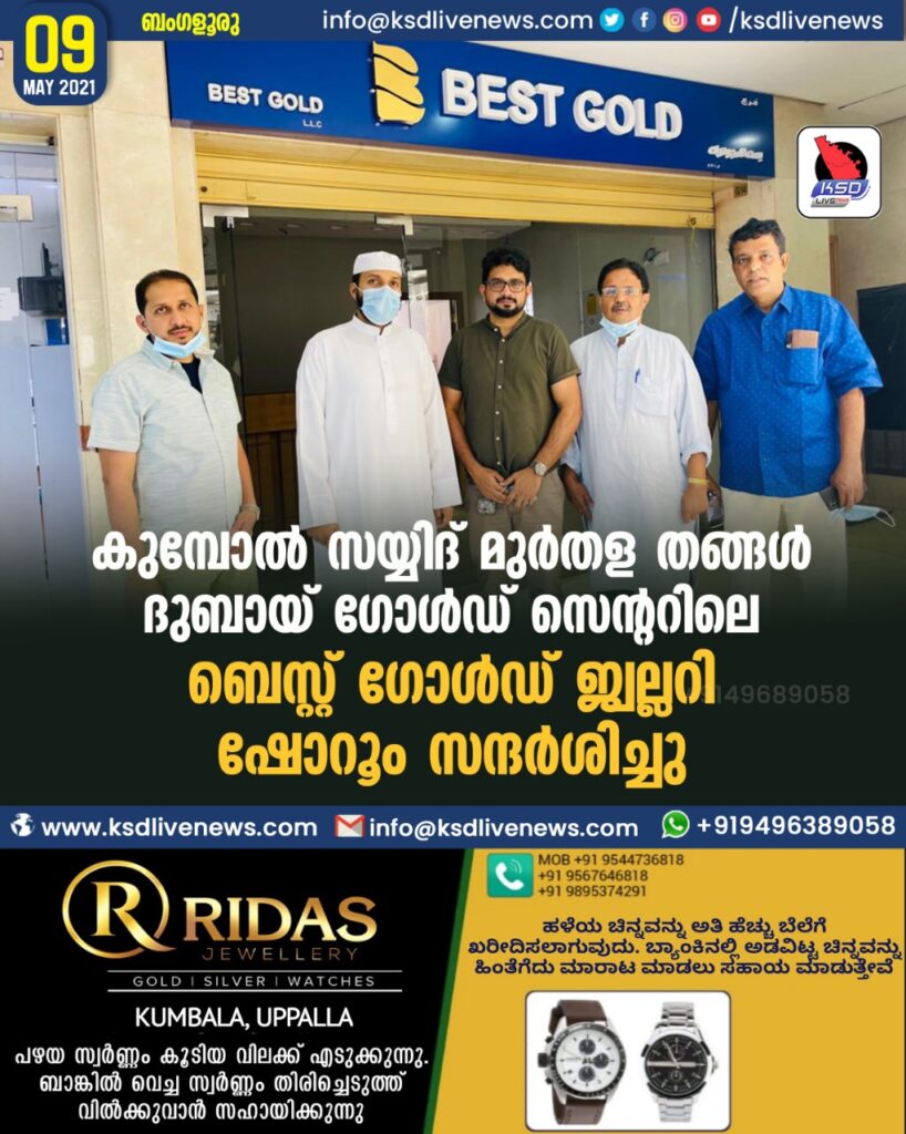 കുമ്പോൽ സെയ്യിദ് മുർത്തള തങ്ങൾ ദുബായ് ഗോൾഡ് സെന്ററിൽ തുറന്നു പ്രവർത്തനം ആരംഭിക്കുന്ന *”ബെസ്റ്റ് ഗോൾഡ്”* ജ്വല്ലറിയുടെ ഷോറൂം സന്ദർശിച്ചു. വാണിജ്യ പ്രമുഖനും ബെസ്റ്റ് ഗോൾഡ് ജോല്ലറി ഗ്രൂപ്പ് മാനെജിങ്‌ ഡയറക്ടർമാരായ സമീർ തളങ്കര , യുസഫ് ഉപ്പള എന്നിവരും മജീദ് തെരുവത്ത് , അഷ്‌റഫ് കർള എന്നിവരും