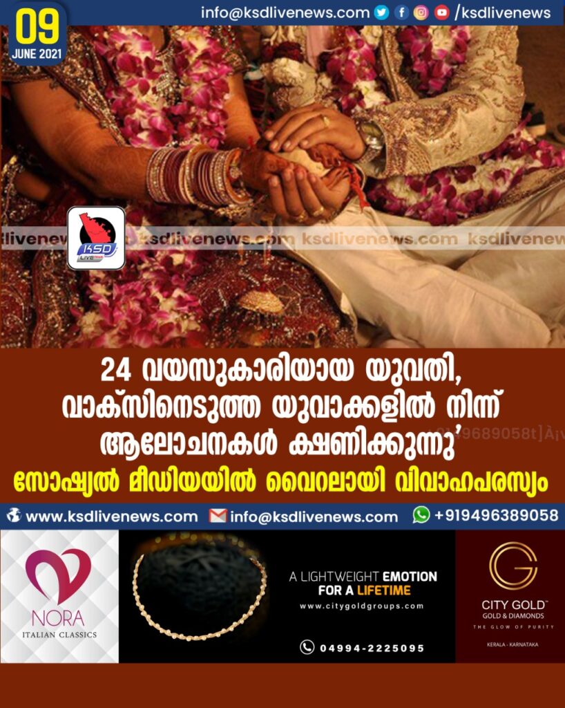 24 വയസുകാരിയായ യുവതി, വാക്സിനെടുത്ത യുവാക്കളില് നിന്ന് ആലോചനകള് ക്ഷണിക്കുന്നു’- സോഷ്യല് മീഡിയയില് വൈറലായി വിവാഹപരസ്യം