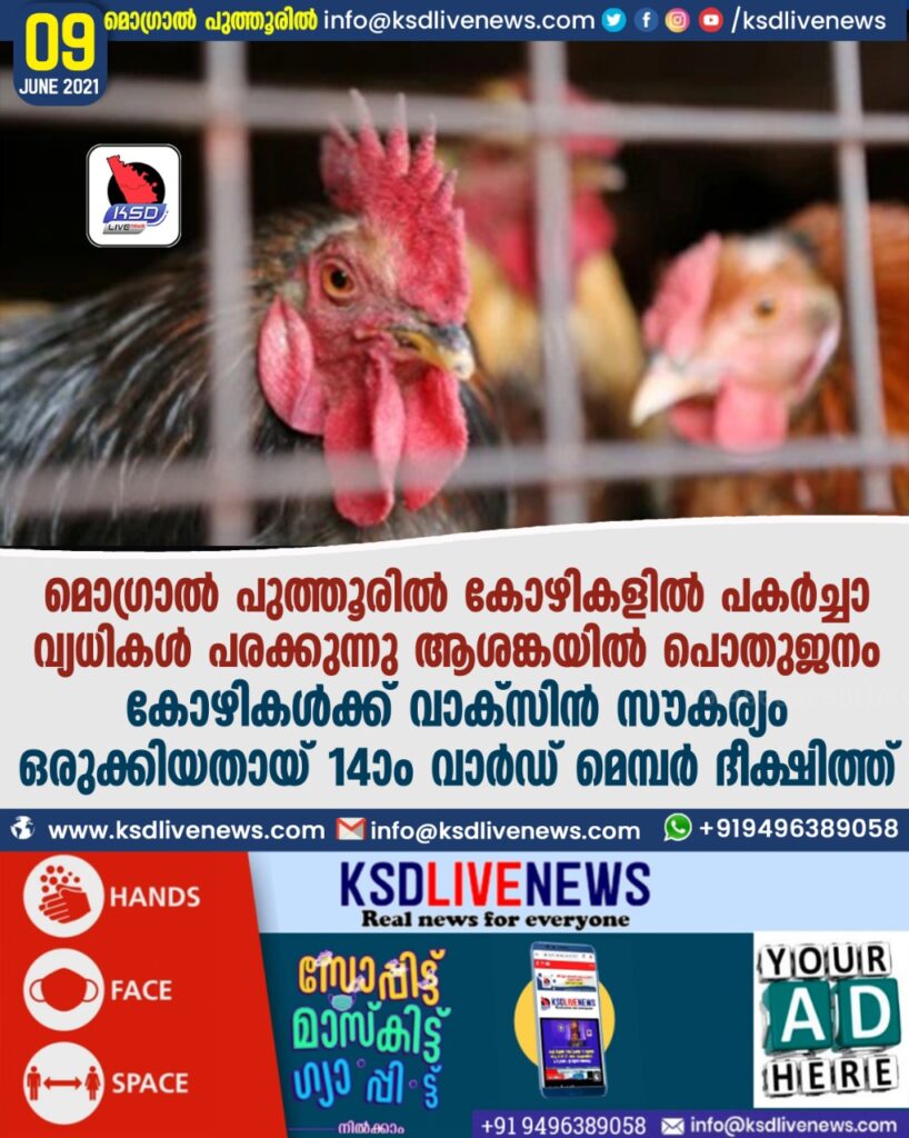 കല്ലങ്കൈ 14-ാം വാർഡിലെ ഒരു വീട്ടിൽ രാവിലെ തന്നെ കോഴികൾ കൂട്ടത്തോടെ ചത്ത് വീണത് ശ്രദ്ധയിൽ പെട്ട വീട്ടുടമ വാർഡ് മെമ്പർ ദീക്ഷിത്തിനെ സമീപിക്കുകയും മെമ്പറിന്റെ സാന്നിധ്യത്തിത്തിൽ മൊഗ്രാൽ പുത്തൂർ ഗവൺമെന്റ് മൃഗാശുപത്രിയിൽ പോസ്റ്റ്മോർട്ടം നടത്തിയപ്പോഴാണ് കോഴികളിൽ പകർച്ചാ രോഗം സ്ഥിരീകരിച്ചത്. രോഗവ്യാപനം തടയുന്നതിന് വാക്സിനേഷൻ സൗകര്യം നിലവിൽ ഉണ്ടെന്നും അതിനായ് കോഴികളിൽ രോഗലക്ഷണം കണ്ടാലോ അസ്വാഭീവമായ് കോഴികൾ ചത്ത് വീഴാൻ തുടങ്ങിയാലോ വാർഡ് മെമ്പറെയോ അടുത്തുള്ള മൃഗാശുപത്രിയുമായോ ബന്ധപെടേണ്ടതാണ്.