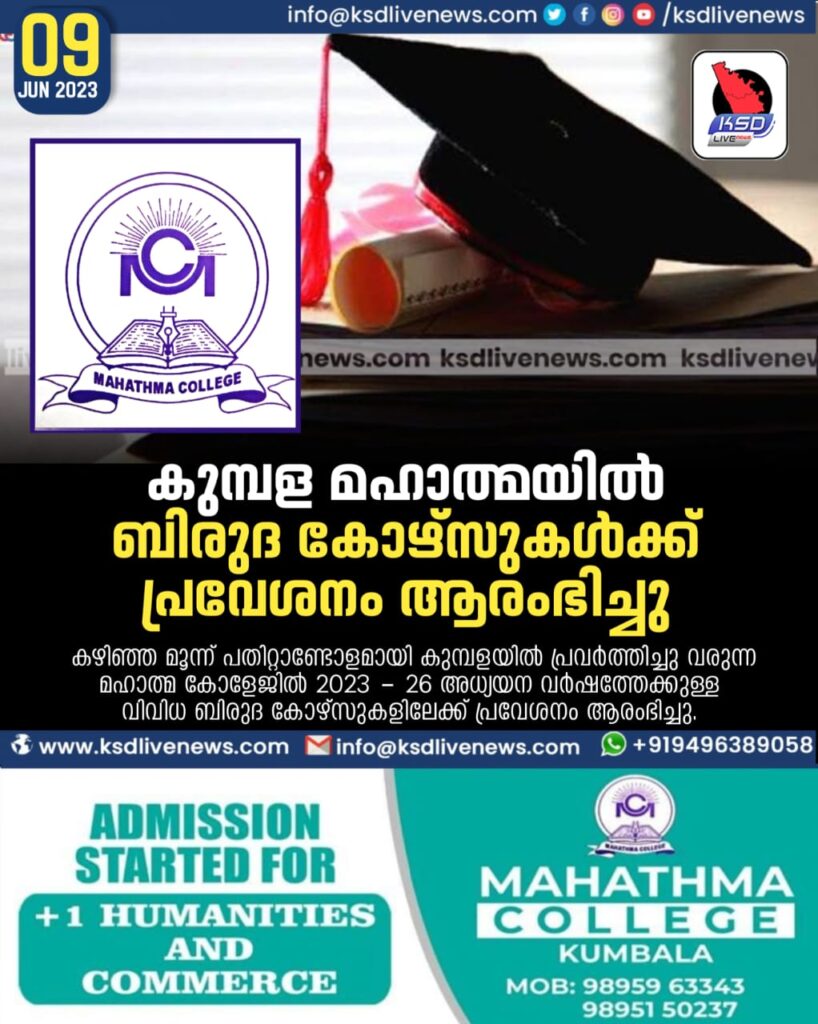 കുമ്പള: കഴിഞ്ഞ മൂന്ന് പതിറ്റാണ്ടോളമായി കുമ്പളയിൽ പ്രവർത്തിച്ചു വരുന്ന മഹാത്മ കോളേജിൽ 2023 – 26 അധ്യയന വർഷത്തേക്കുള്ള വിവിധ ബിരുദ കോഴ്സുകളിലേക്ക് പ്രവേശനം ആരംഭിച്ചു.