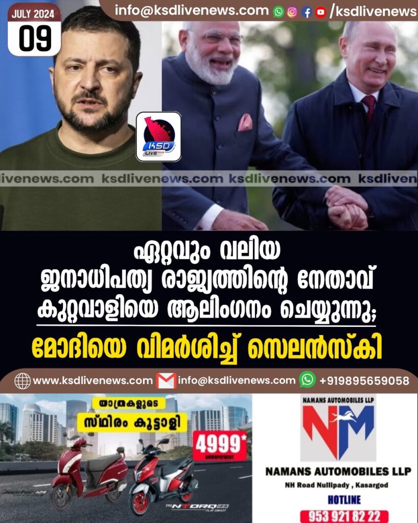 റഷ്യൻ പ്രസിഡന്റ് വ്ലാദിമിർ പുടിനും പ്രധാനമന്ത്രി നരേന്ദ്ര മോദിയും കൂടിക്കാഴ്ച നടത്തിയതിന് പിന്നാലെ വിമർശനവുമായി യുക്രൈൻ പ്രസിഡന്റ് വ്ളോഡിമിർ സെലൻസ്കി. ലോകത്തിലെ ഏറ്റവും വലിയ ജനാധിപത്യ രാജ്യത്തിന്റെ നേതാവ് കുറ്റവാളിയെ കാണുന്നു, നരേന്ദ്ര മോദിയുടെ സന്ദർശനം ഏറെ നിരാശയുണ്ടാക്കിയെന്നും സമാധാനശ്രമങ്ങൾക്ക് കനത്ത തിരിച്ചടിയാണെന്നും സെലൻസ്കി പ്രതികരിച്ചു.