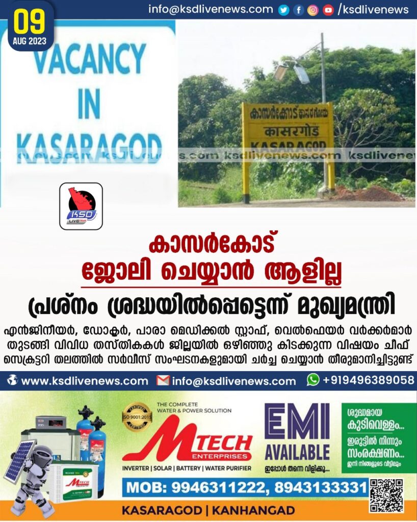 കാസർകോട് ജോലി ചെയ്യാൻ ആളില്ല, പ്രശ്നം ശ്രദ്ധയിൽപ്പെട്ടെന്ന് മുഖ്യമന്ത്രി