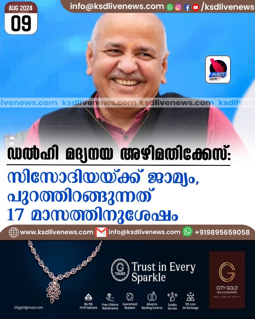 ഡൽഹി മദ്യനയ അഴിമതിക്കേസ്: സിസോദിയയ്ക്ക് ജാമ്യം, പുറത്തിറങ്ങുന്നത് 17 മാസത്തിനുശേഷം