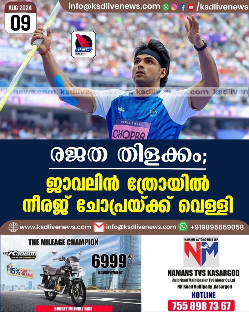 രജത തിളക്കം; ജാവലിൻ ത്രോയില് നീരജ് ചോപ്രയ്ക്ക് വെള്ളി