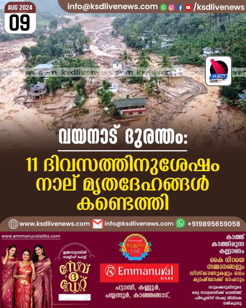 വയനാട് ദുരന്തം: 11 ദിവസത്തിനുശേഷം നാല് മൃതദേഹങ്ങള്‍ കണ്ടെത്തി