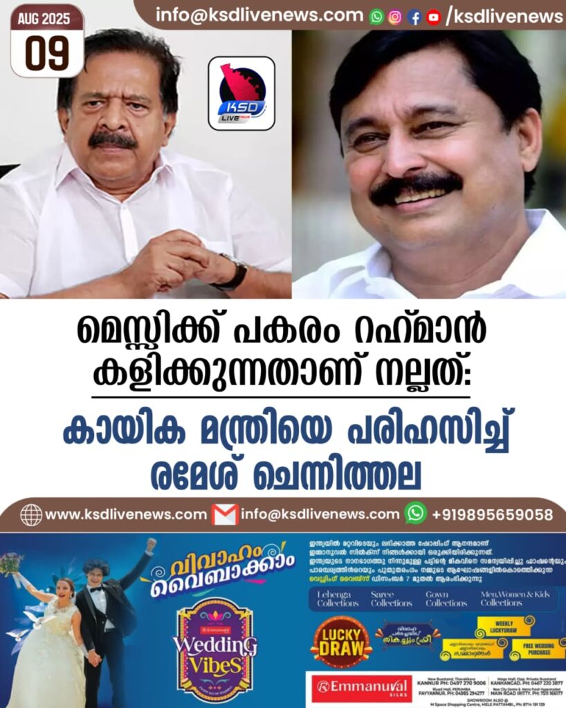 മെസ്സിക്ക് പകരം റഹ്മാൻ കളിക്കുന്നതാണ് നല്ലത്; കായിക മന്ത്രിയെ പരിഹസിച്ച് രമേശ് ചെന്നിത്തല