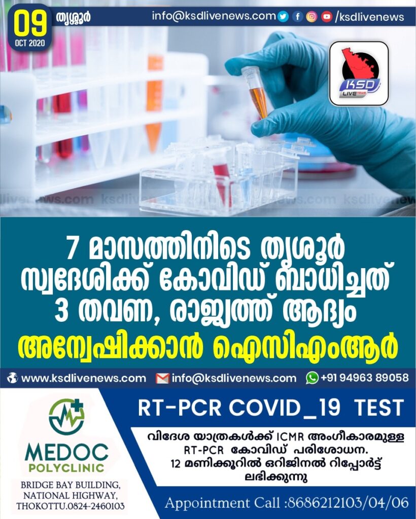 7 മാസത്തിനിടെ തൃശൂർ സ്വദേശിക്ക് കോവിഡ് ബാധിച്ചത് 3 തവണ , രാജ്യത്ത് ആദ്യം ; അന്വേഷിക്കാൻ ഐസിഎംആർ