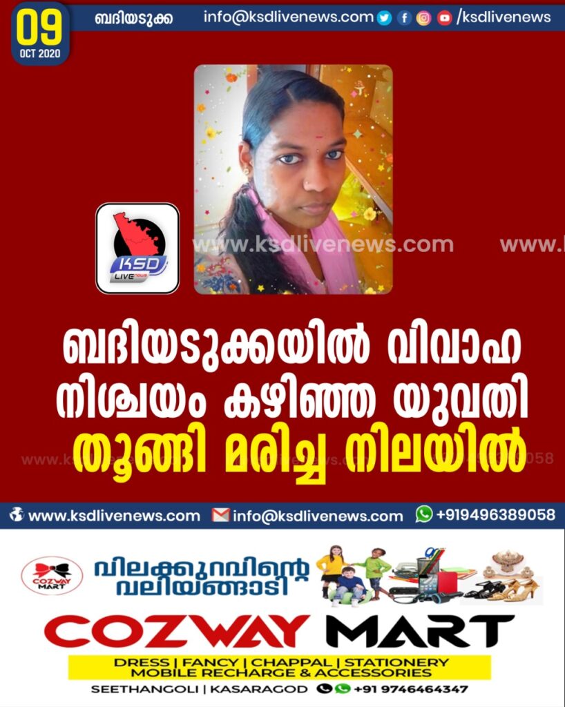 ബദിയടുക്കയിൽ വിവാഹ നിശ്ചയം കഴിഞ്ഞ യുവതി തൂങ്ങി മരിച്ച നിലയിൽ
