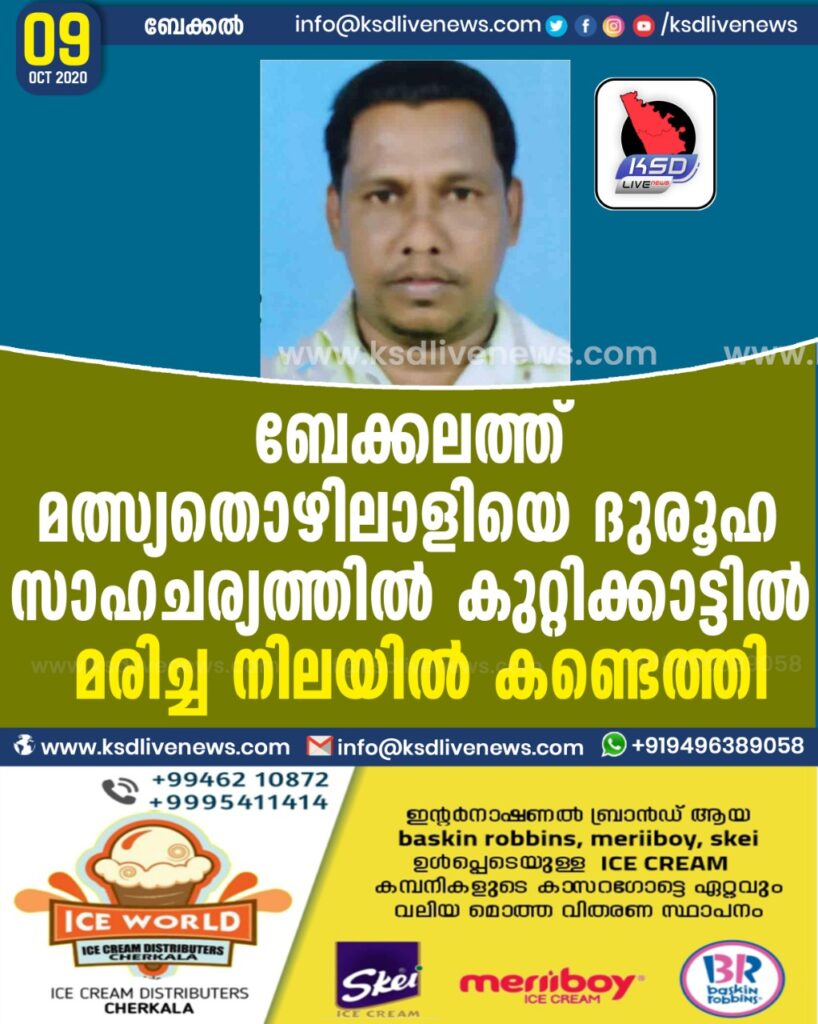 ബേക്കലത്ത്‌ മത്സ്യതൊഴിലാളിയെ ദുരൂഹ സാഹചര്യത്തിൽ കുറ്റിക്കാട്ടിൽ മരിച്ച നിലയിൽ കണ്ടെത്തി