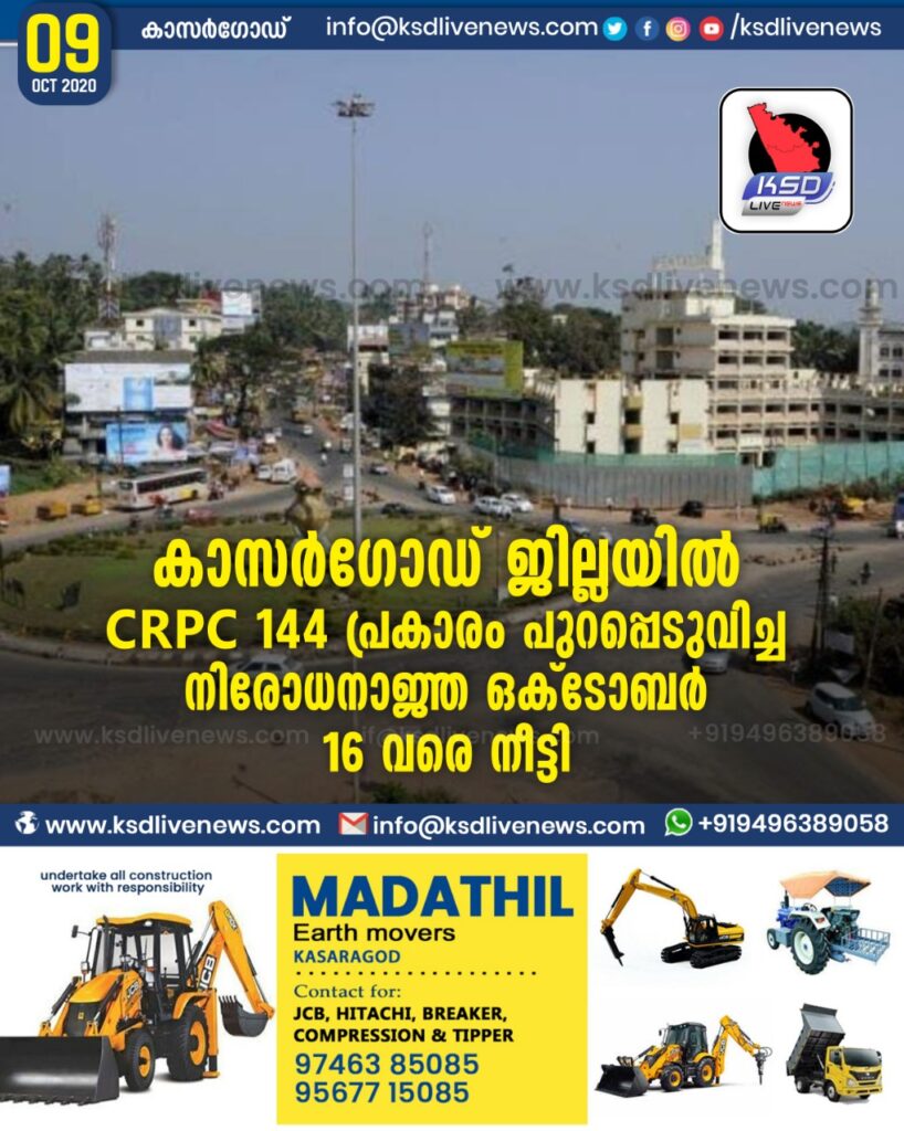 കാസർഗോഡ് ജില്ലയില് CRPC 144 പ്രകാരം പുറപ്പെടുവിച്ച നിരോധനാജ്ഞ ഒക്ടോബര് 16 വരെ നീട്ടി