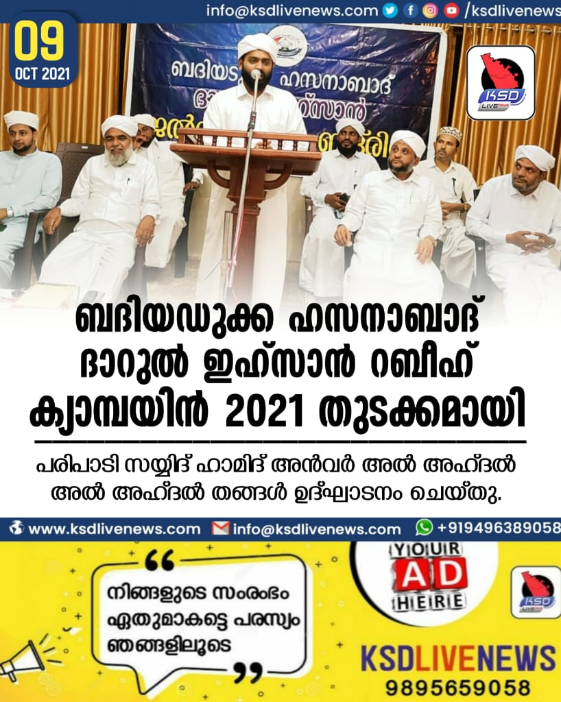 ബദിയഡുക്ക: ഹസനാബാദ് ദാറുൽ ഇഹ്സാനിൽ റബീഹ് കാമ്പയ്ന് തുടക്കം കുറിച്ചു, പരിപാടി സയ്യിദ് ഹാമിദ് അൻവർ തങ്ങൾ ഉദ്ഘാടനം ചെയ്തു; ഒരു മാസക്കാലം നീണ്ട് നിൽക്കുന്ന കാമ്പയ്നിൽ വൈവിധ്യമാർന്ന ഹുബ്ബുറസൂൽ ഹുബ്ബുറസൂൽ പ്രോഗ്രാമുകളും, വിദ്യാർത്ഥികളുടെ കലാപരിപാടികളും മറ്റു നടക്കും