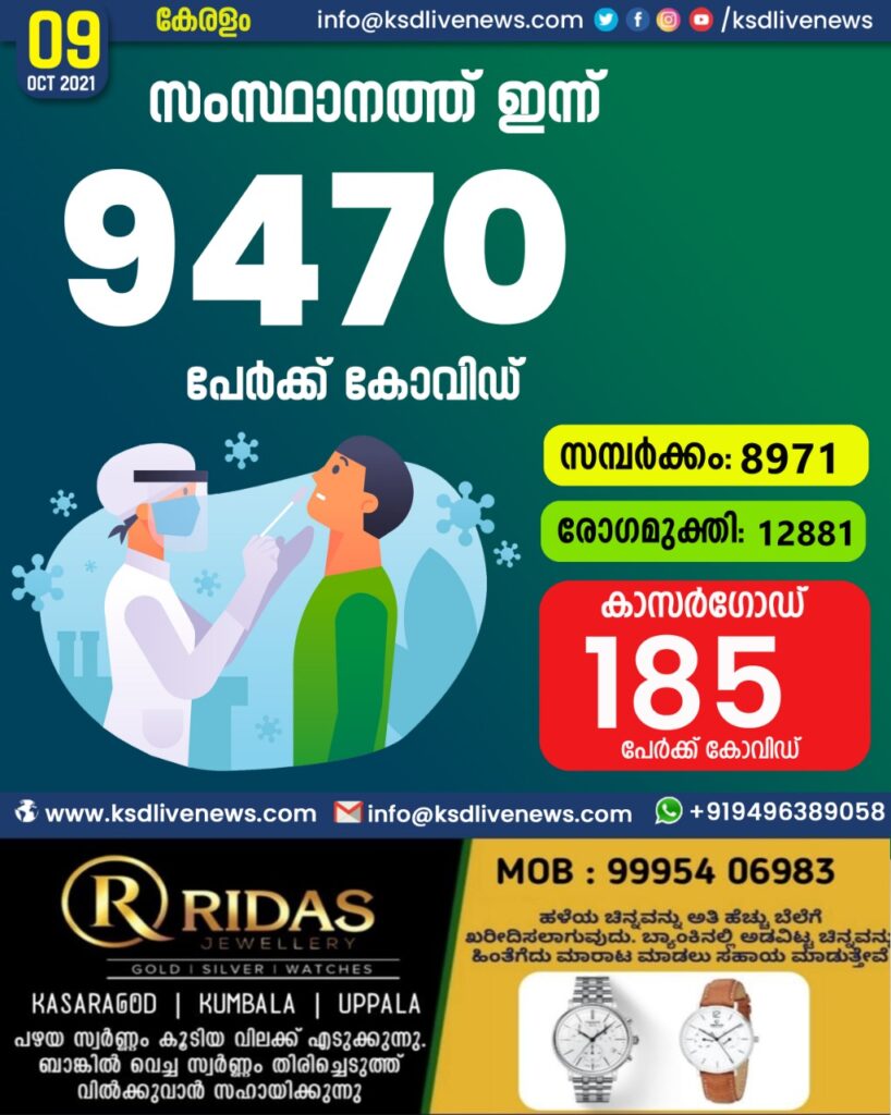 ആശ്വാസം ; കേരളത്തിൽ കോവിഡ് കുറയുന്നു; സംസ്ഥാനത്ത് ഇന്ന് 9470 പേർക്ക് കോവിഡ് സ്ഥിരീകരിച്ചു. സമ്പർക്കം വഴി 8971 പേർക്കും ; ആശ്വാസമായി 12881പേർക്ക് രോഗ മുക്തിയും ; കാസർഗോഡ് ജില്ലയിൽ 185 പേർക്ക് പുതിയ കോവിഡ് കേസുകൾ ; മരണം 101