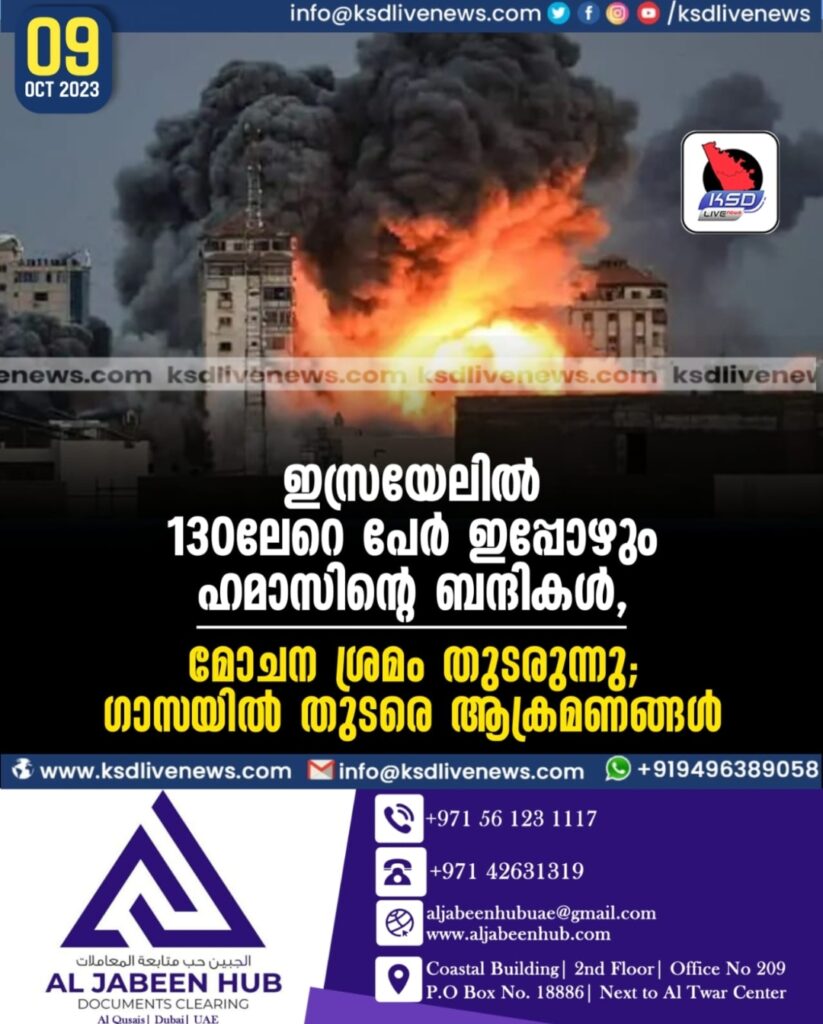 ഇസ്രയേലില് 130ലേറെ പേര് ഇപ്പോഴും ഹമാസിന്റെ ബന്ദികള്, മോചന ശ്രമം തുടരുന്നു; ഗാസയില് തുടരെ ആക്രമണങ്ങള്