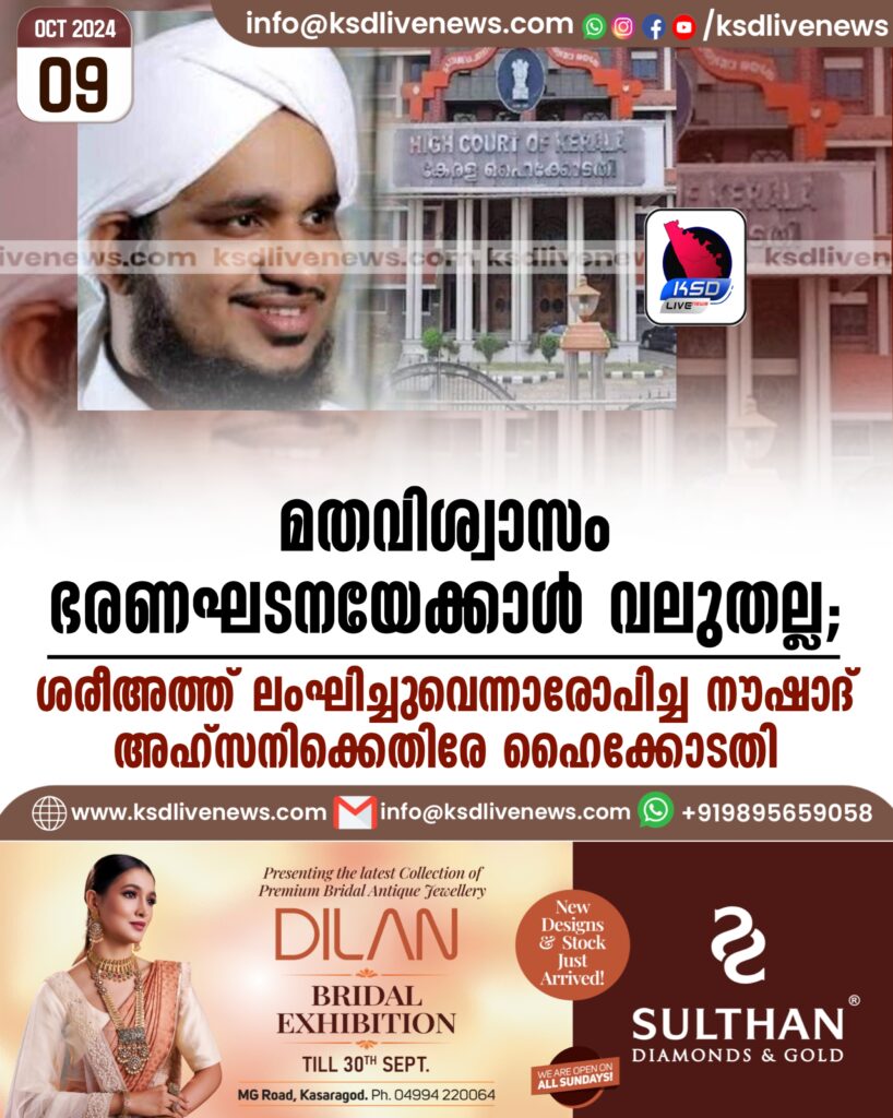 മതവിശ്വാസം ഭരണഘടനയേക്കാള് വലുതല്ല; ശരീഅത്ത് ലംഘിച്ചുവെന്നാരോപിച്ച നൗഷാദ് അഹ്സനിക്കെതിരേ ഹൈക്കോടതി