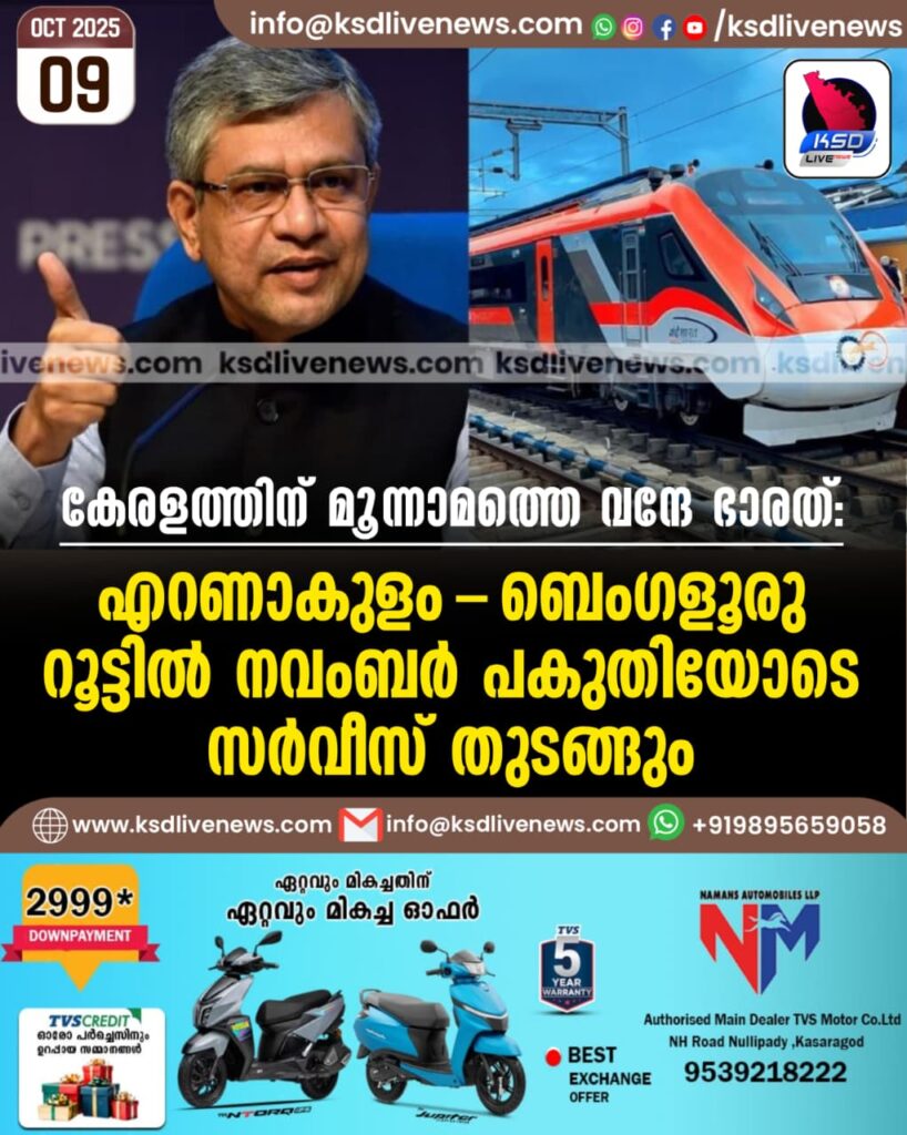 കേരളത്തിന് മൂന്നാമത്തെ വന്ദേ ഭാരത്; എറണാകുളം-ബെംഗളൂരു റൂട്ടില് നവംബര് പകുതിയോടെ സര്വീസ് തുടങ്ങും