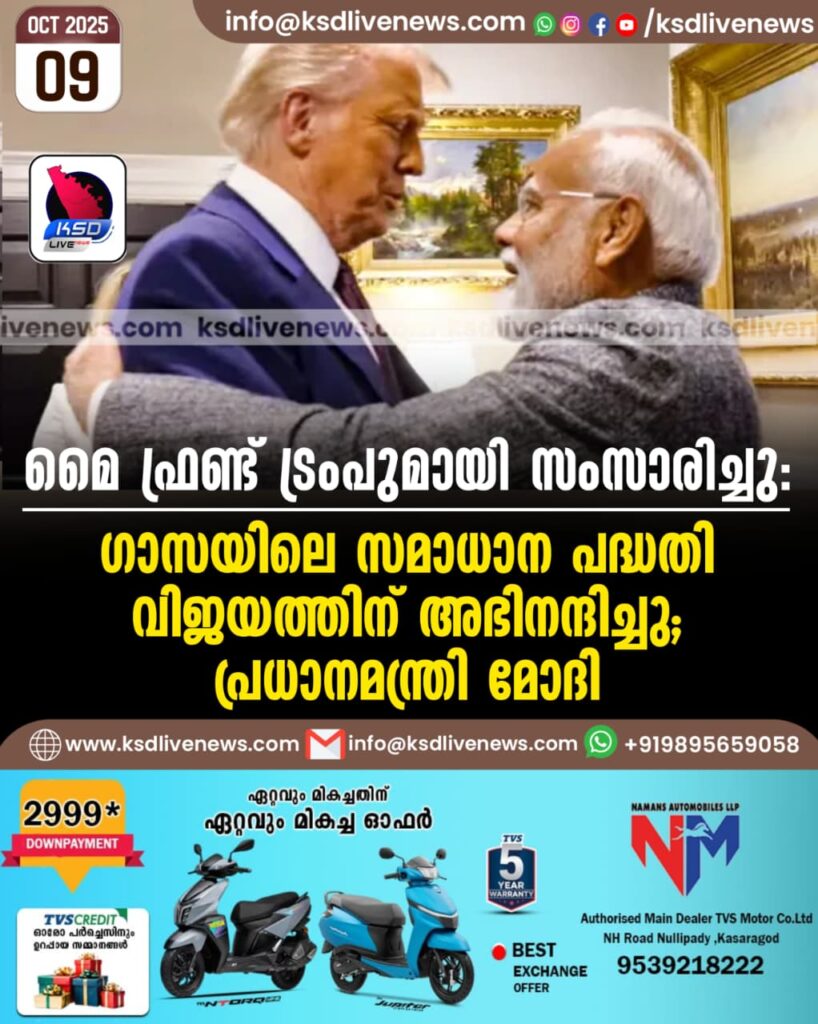 മൈ ഫ്രണ്ട് ട്രംപുമായി സംസാരിച്ചു: ഗാസയിലെ സമാധാന പദ്ധതി വിജയത്തിന് അഭിനന്ദിച്ചു; പ്രധാനമന്ത്രി മോദി