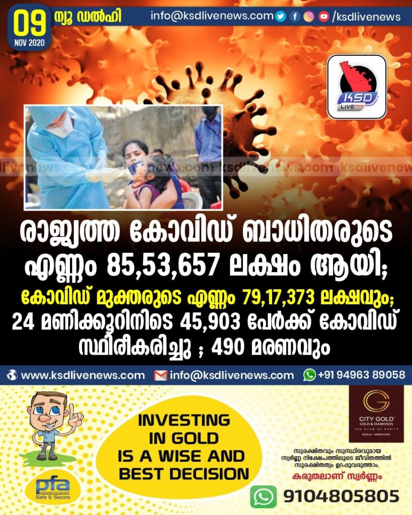 രാജ്യത്ത കോവിഡ് ബാധിതരുടെ എണ്ണം 85,53,657 ലക്ഷം ആയി ; കോവിഡ് മുക്തരുടെ എണ്ണം 79,17,373 ലക്ഷവും ;