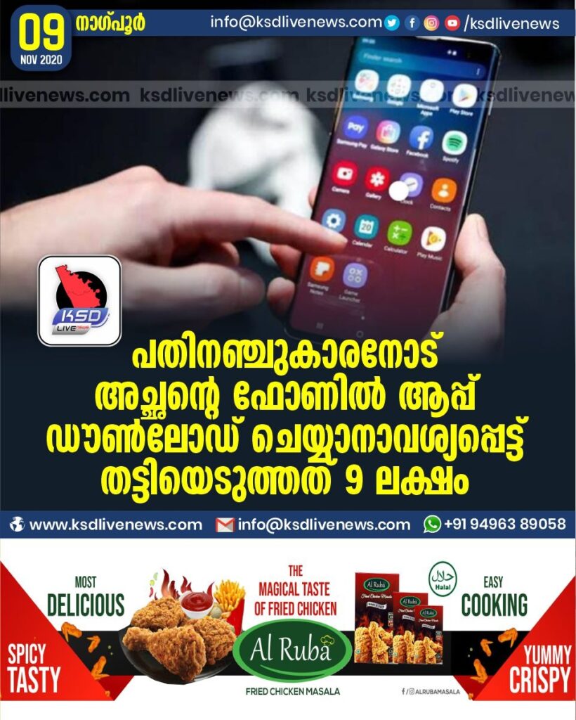 പതിനഞ്ചുകാരനോട് അച്ഛന്റെ ഫോണില് ആപ്പ് ഡൗണ്ലോഡ് ചെയ്യാനാവശ്യപ്പെട്ട് തട്ടിയെടുത്തത് 9 ലക്ഷം