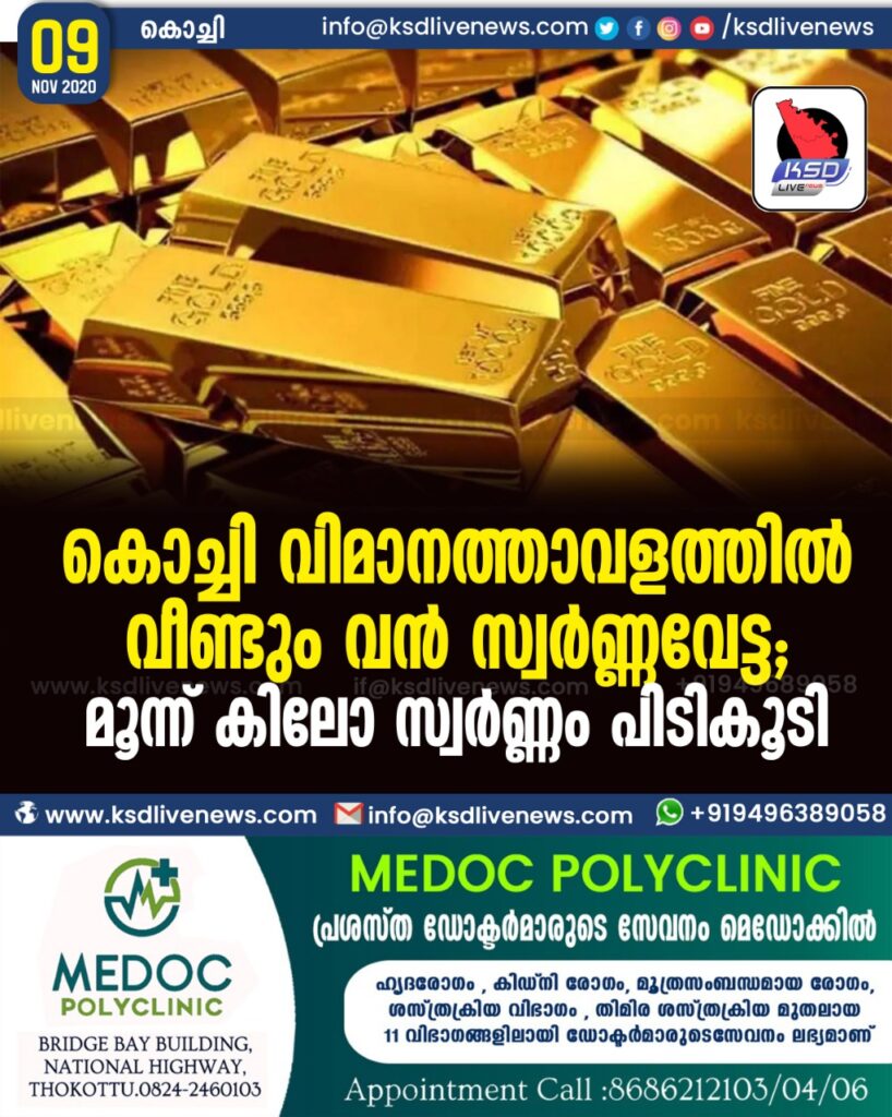 കൊച്ചി വിമാനത്താവളത്തിൽ വീണ്ടും വൺ സ്വർണ്ണവേട്ട ; മൂന്ന് കിലോ സ്വർണ്ണം പിടികൂടി