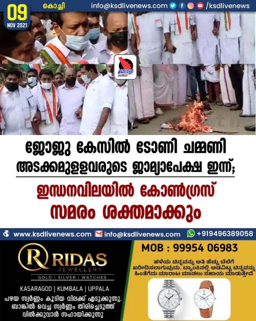 ജോജു കേസിൽ ടോണി ചമ്മണി അടക്കമുളളവരുടെ ജാമ്യാപേക്ഷ ഇന്ന് ; ഇന്ധനവിലയിൽ കോൺഗ്രസ് സമരം ശക്തമാക്കും