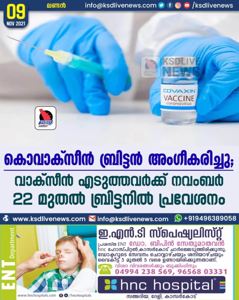 കൊവാക്സീന്‍ ബ്രിട്ടന്‍ അംഗീകരിച്ചു; വാക്സീന്‍ എടുത്തവര്‍ക്ക് നവംബര്‍ 22 മുതല്‍ ബ്രിട്ടനില്‍ പ്രവേശനം