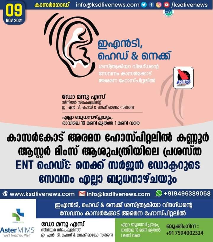 കാസർകോട് അരമന ഹോസ്പിറ്റലിൽ കണ്ണൂർ ആസ്റ്റർ മിംസ് ആശുപത്രിയിലെ പ്രശസ്ത ENT & ഹെഡ്& നെക്ക് സർജൻ ഡോക്ടറുടെ സേവനം എല്ലാ ബുധനാഴ്ചയും