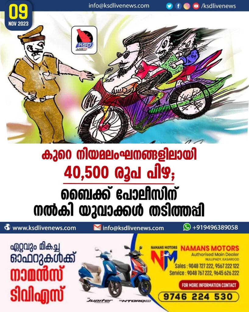 കുറെ നിയമലംഘനങ്ങളിലായി 40,500 രൂപ പിഴ; ബൈക്ക് പോലീസിന് നല്‍കി യുവാക്കള്‍ തടിത്തപ്പി