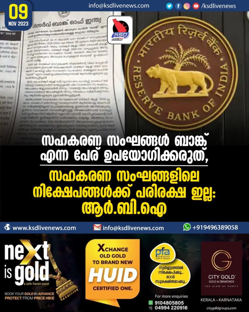 സഹകരണ സംഘങ്ങൾ ബാങ്ക് എന്ന പേര് ഉപയോഗിക്കരുത്, സഹകരണ സംഘങ്ങളിലെ നിക്ഷേപങ്ങൾക്ക് പരിരക്ഷ ഇല്ല’:ആര്‍ബിഐ